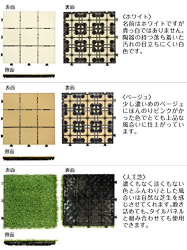 - 材質・柄色は厳選3タイプ。パネルはベランダやお庭にしっくりなじむ、扱いやすい材質・柄色を厳選。高級感溢れる陶器仕上げのホワイトとベージュ、そして年中きれいな緑の人工芝仕上げの3タイプをご用意しました。 3つのタイプを使ってベランダやバルコニー、お庭の壁やフェンスに合わせてコーディネートできます。1色でスッキリまとめたり、人工芝をアクセントに使用したりと思いのままアレンジが楽しめます