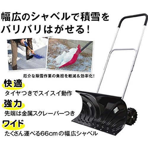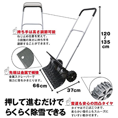 バリバリ雪を剥がす金属製のスクレーパーと、デコボコのあるタイヤで除雪作業をスムーズに進めることができます。 幅66cmととってもワイドなので、どんどん雪を押し出します。 長さは120cm・125cm・130cmの3段階に調節できるので、身長に合わせて使うことができます。