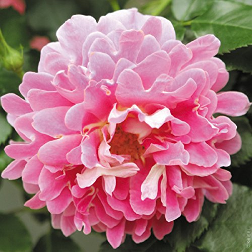 表がピンク色、裏が白色の花色とフリルが入った花弁が織りなすハーモニーが美しいつるバラ。ポールやオベリクスなどに仕立てると、大輪花が見事に咲き誇ります。