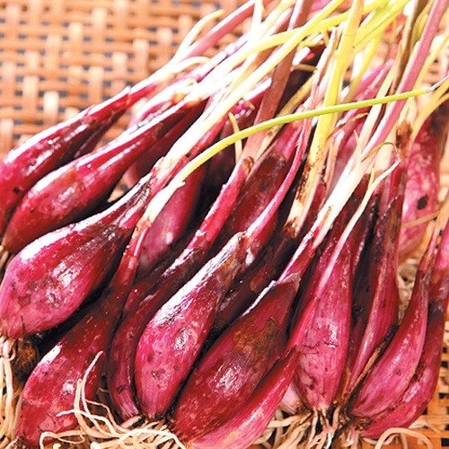 世界初、ラッキョウと玉ねぎをかけ合わせて誕生した品種。外皮が透き通った赤紫色で、「越のパール」より球が大きい。病害虫に強いので栽培が簡単です。葉から球まで利用でき、油炒めや天ぷらにすると絶品です。
