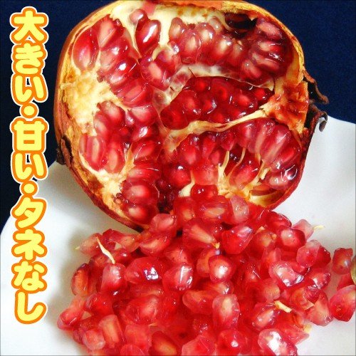 大きい・甘い・タネなしと三拍子そろったザクロ。硬いタネがなく、小さなタネの痕跡の実でゴマのように噛み砕ける!酸味が少なく、果重350~500gの大果。