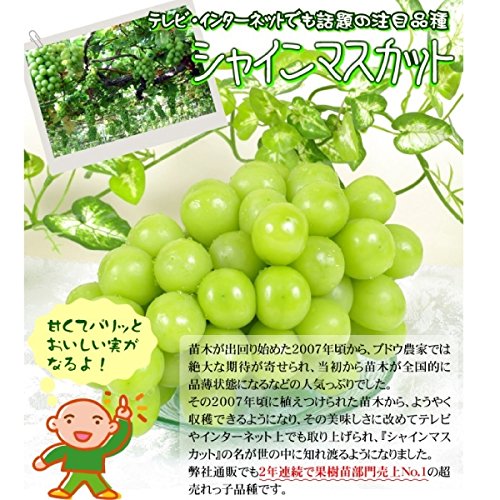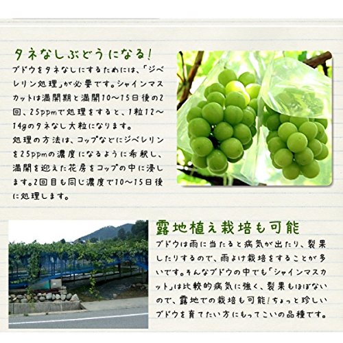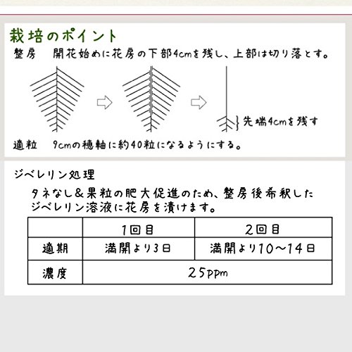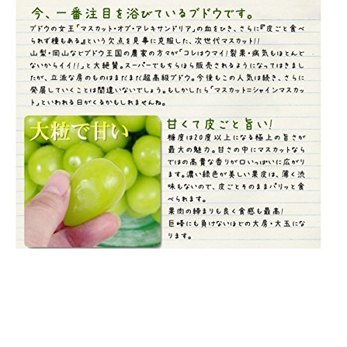 糖度約20度と甘く、酸味が少ない!爽やかなマスカット香が素晴らしく、果肉は締まって食味・食感抜群 皮が薄く渋味がないので、皮ごと美味しく食べられます。日持ち性が良好で、花振るい少なく裂果もなく品質抜群!!ジベレリン処理により、1粒12~14gのタネなし大粒になります。