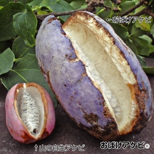 果長約20cmの巨大アケビ!!山で実っているアケビの実と比べると、信じられないほどの大きさ。中の白い果肉はもちろんのこと、この大きさでも皮まで美味しく利用できます。(三葉)