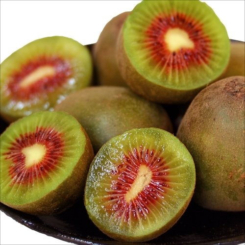 緑~黄緑色の果肉の中心部が鮮やかな紅色に染まる、紅芯キウイの代表的品種「紅妃」。その「紅妃」より実つきの良い系統を選抜しました。糖度19~20度と高いうえに、酸度は緑肉キウイ「ヘイワード」の半分以下と非常に少ないので、糖度以上に甘~く感じます。果重70~120g。収穫後の追熟は容易ですが、日持ち性は高くありません。樹上完熟もでき、完熟果の味わいはさらに絶品です!!