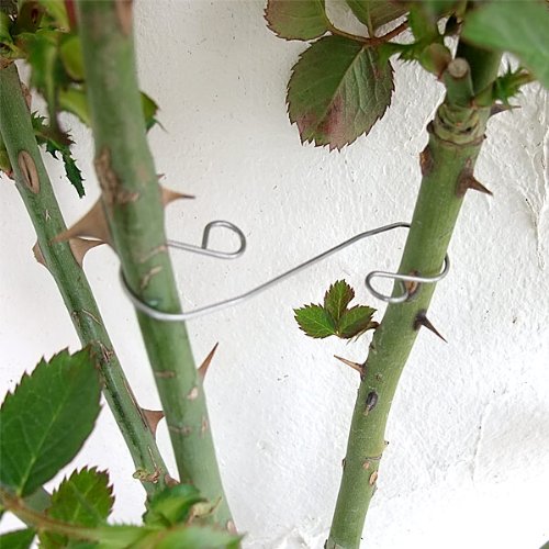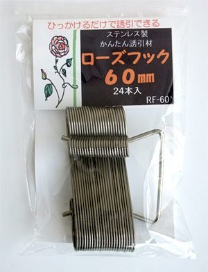 - バラの枝の誘引にとても便利な、ベルツモアのかんたん誘引材、ローズフック。いろいろ使える3サイズセットです。 四方に広がってしまった枝と枝、支柱と枝などただひっかけるだけで誘引でき、バラやユリ、野菜などの誘引にとても重宝します。 トゲのあるバラはトゲに引っかからないように誘引するのが一苦労ですが、このローズフックを使えば手袋をしたままでも簡単にできます。 ステンレス製(S字型バネ性加工)なので錆びずに繰り返し使用でき、フック自体が細いので目立ちにくく美観も損ないません。 さらにS字型バネ性加工の為、バネのしなりによりやさしくしっかり支えてくれますので誘引する植物も傷つけません。