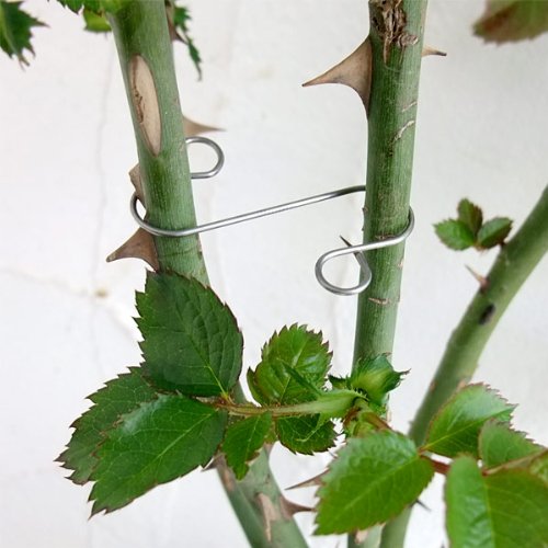 ビニタイや紐でのわずらわしさを解消してくれるすばらしい誘引材! 四方に広がってしまった枝と枝、支柱と枝などただひっかけるだけ。 バラやユリ、野菜などの誘引にとても重宝します。 特に、トゲのあるバラはトゲに引っかからないように誘引するのは一苦労です。 このローズフックは、ただひっかけるだけ。 手袋をしたままでも簡単にできます。