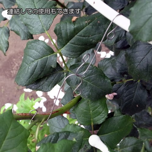 - また、ステンレス(S字型バネ性加工)ですので錆びずに繰り返し使用できますし、フック自体が細いので目立ちにくく美観も損ないません。 さらにS字型バネ性加工の為、バネのしなりによりやさしくしっかり支えてくれますので 誘引する植物も傷つけません。