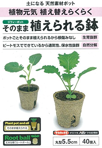 - ジフィーポット丸型5.5cm ピートモスを主原料とした育苗ポット、ジフィーポット丸型直径5.5cm 40個入りです。中粒の種の種まきや、移植を嫌う植物の育成に。用土を入れて直接種をまいてください。通気性が良く根の成長が早いので、健全な苗が育ちます。ポットのまま土に定植でき、ポットはやがて分解されて土に戻ります。植え替えによる根の植え傷みがありません。