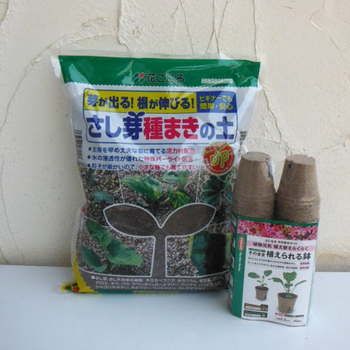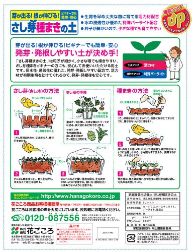 - ○使用方法 さし芽・さし木の方法:さし芽・種まきの土をポットに入れ、水を与えて棒で穴をあけ、さし穂を深くさします。土を押さえ水を与えて用土を絞め、ビニールなどで覆い湿度を保ち(土を乾かさない)直射日光に当てないようにします。 種まきの方法:さし芽種まきの土をポットに入れて種をまき、用土で覆います。種が流れないように水を与えます。発芽するまで水を切らさないようにします。