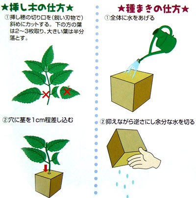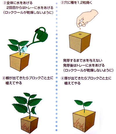 - 種まきの場合 1.穴に種を1~2粒ずつ蒔きます。 2.水をやります。(土に植え替えるまで水をやってください) 3.芽が出てきたらブロックごと土に移植します。