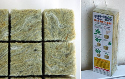 - ロックウールブロックは水耕栽培用育苗ブロックです。玄武岩を高温で焼き綿状にしたもので、pH濃度を植物によい弱酸性に保つ効果があります。マットに吸水させるだけですぐに種まきやさし芽(挿し木)ができます。成分が均一で安定しているので、育成のコントロールがしやすく、無菌で病虫害の心配も不要。通気性や保水性にも優れており、土の流出もないので清潔です。 育苗、種まき、さし芽、球根の栽培に最適で、特にペチュニアやベゴニアなどの細かい種をまくときは便利です。観葉植物、セントポーリア、さつきなどのさし芽にもよく利用されます。原料を綿あめのような繊維状に加工しているので、土と比べて大変軽く、ハンギングバスケットによる栽培に向いています。プランターや鉢物で栽培する場合も、土と比べて重量が抑えられるので作業が楽になります。