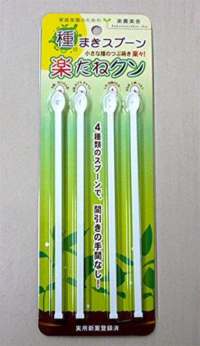 - 種まきって結構手間がかかりますよね?多くまきすぎたり、上手く摘めなくて間引きの手間も一苦労だったり。そんな種まきの悩みを解決する便利グッズ。小さな種のつぶまきが正確にできて無駄なしのアイデア商品です。4種類のスプーンで、品種ごとの種の大きさに合わせて種を無駄なくすくってまくことができ、間引きの手間なし!種の大きさと形状に応じてスプーンを使い分けて下さい。仕様:スプーン全長16.6cm 土穴あけ部 5×6×3mmスプーン窪みサイズ:直径4mm:大根、ほうれんそう、コート種子、ペレットコート種子など直径2mm:白菜、キャベツ、カブラ、チンゲンサイ、ミズナ、コマツナ、バジルなど直径1.2mm:シソ、かすみ草、わすれな草、スミレ草など直径1.5mm:レタス類、玉ねぎ、人参、パセリ、カーネーション、スターチスなど