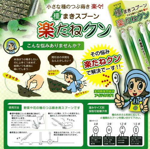 種まきって結構手間がかかりますよね?多くまきすぎたり、上手く摘めなくて間引きの手間も一苦労だったり。そんな種まきの悩みを解決する便利グッズ。小さな種のつぶまきが正確にできて無駄なしのアイデア商品です。4種類のスプーンで、品種ごとの種の大きさに合わせて種を無駄なくすくってまくことができ、間引きの手間なし!種の大きさと形状に応じてスプーンを使い分けて下さい。仕様:スプーン全長16.6cm 土穴あけ部 5×6×3mmスプーン窪みサイズ:直径4mm:大根、ほうれんそう、コート種子、ペレットコート種子など直径2mm:白菜、キャベツ、カブラ、チンゲンサイ、ミズナ、コマツナ、バジルなど直径1.2mm:シソ、かすみ草、わすれな草、スミレ草など直径1.5mm:レタス類、玉ねぎ、人参、パセリ、カーネーション、スターチスなど