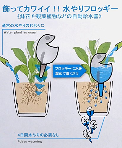 - 鉢花や観葉植物の土にさして自動給水するカワイイ給水器。 5号鉢に使用する場合、フロッギー(カエル)の中に水をためておくだけで、約4日間水やりなし!いつもの水やりの手間が軽減できます。 鉢物の土にさして、フロッギーの口から本体に約140ミリリットルの水を入れます。 鉢土に差し込んだ下部の焼き物の突起部からゆっくりと土に水分が供給されます。 本体が透明なので水の減り具合も一目でわかり、水の補給のタイミングを逃しません。 デザイン・色合いも可愛く、アクセサリーとしてもステキです。