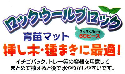 - ロックウールブロックは水耕栽培用育苗ブロックです。 玄武岩を高温で焼き綿状にしたもので、pH濃度を植物によい弱酸性に保つ効果があります。 マットに吸水させるだけですぐに種まきやさし芽(挿し木)ができます。