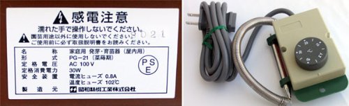 - セット内容:家庭用発芽育苗器:菜蒔期(さいじき)×1グリーンサーモZY-6A×1育苗ポットミニ・12穴(41ミリ角型) 6枚入り×1○菜蒔期 本体仕様:外寸幅約42cm、奥行27cm、高さ約22.5cm(コード突出部含まず)加温能力 室温+約18度 ご使用環境によって異なります電源 AC100V50/60Hz消費電力30W重量 約1.0kg電源コード 長さ1.3m材質 本体PP、フードPVC安全装置 温度ヒューズ・電流ヒューズ内蔵○グリーンサーモZY-6A(加温用・空中地中温度管理用)仕様:完全防湿タイプのサーモスタット地中・空中兼用タイプです。