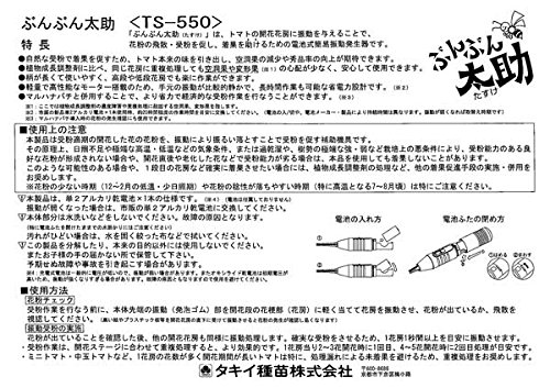 - トマトの受粉に!プロ用の振動受粉器。 ハウス栽培に向いています。 「ぶんぶん太助(たすけ)」は、トマトの開花花房に振動を与えることで、花粉の飛散・受粉を促し、着果を助けるための電池式簡易振動発生器です。 →ぶんぶん太助の取扱説明書(Amazonでは'ぶんぶん太助の取扱説明書'へのリンクは掲載されません)を見るサイズ:長さ51cm<特長>・花粉を受粉させることで着果を促すため、果実の種つきがよく、空洞果の抑制や秀品率の向上が期待できます。