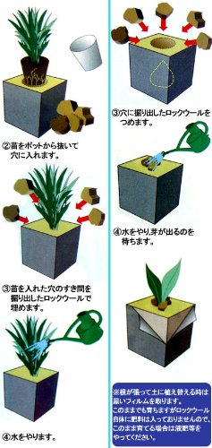 - 苗の植え方1.ハサミまたはカッターで苗の入る大きさに穴を掘ります。 2.苗をポットから抜いて穴に入れます。 3.苗を入れた隙間に掘り出したロックウールを詰めます。 4.水をやります。 球根の植え方1.ハサミまたはカッターで球根の入る穴を掘ります。 2.球根を穴に入れます。 3.穴に掘り出したロックウールを詰めます。 4.水をやり、芽が出るのを待ちます。