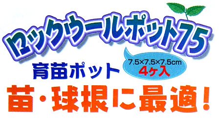 - また、国際がん研究機関(IARC)による評価でお茶やナイロンと同じ、「人に対する発がん性について分類しない」グループ3に分類されています。 ロックウールポット75は苗の植え付けや球根の栽培に最適です。 また、別売のロックウールブロックやロックウール栽培マットで育苗した苗を、そのまま植えつけるのにも便利です。 植え付け後はお好みの容器に入れて、そのままお育ていただけます。 7.5cm×7.5cm×7.5cmのブロック4個入りです。 5パックセット(合計20個)でお届けします。