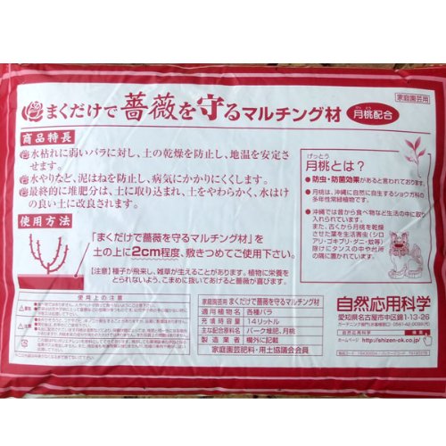 - 防虫・防菌・防カビ効果があるとされる月桃の葉を乾燥させたものと、バーク堆肥を混合したマルチング材です。土の上に2cmほどぱらぱらとまくだけで、水切れに弱いバラの根を乾燥から守り、地温を安定させます。また、水やりや雨などからの泥はねを防止し、病気にかかり難くする効果があります。