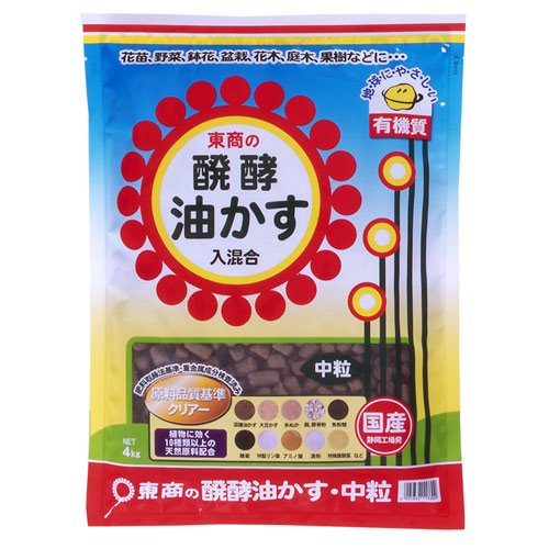 - 品質が保証された安心な原料のみを使用した醗酵油かす。花付き・実付きが良くなるアミノ酸や美味しさを高めるアミノ酸が豊富に含まれています。菜種油かす、大豆かすや特製リン酸など天然原料が豊富に配合されているので、チッソ・リン酸・カリだけではなく、ビタミンや微量要素など植物の生育に必要な栄養がいっぱい!東商独自の特殊醗酵菌とバイオ技術で醗酵させています。鉢やプランター栽培の追肥に便利な中粒状です。