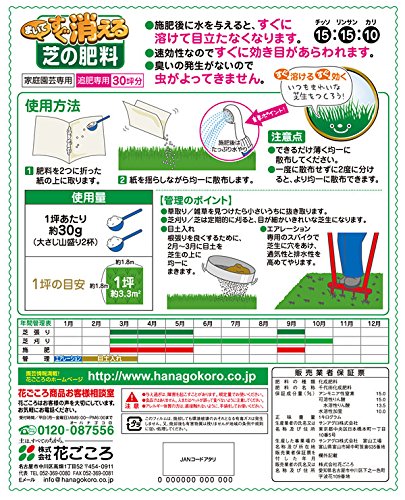 - 少量でしっかり効く、芝生専用の細粒状化成肥料です。施肥後に水を与えるとすぐに溶けて目立たなくなるタイプで、ペットが誤食する心配が少なくなります。追肥専用。芝生は定期的な刈り込みをしますので、通常の植物よりも肥料を多めに必要とし、肥料切れを起こすと全体に葉が黄色くまだらになり、見苦しくなります。定期的な施肥により、鮮やかなグリーンを保つことができます。日本芝の場合は4~8月に2ヶ月に1度、西洋芝の場合は3~5月と9~11月に日本芝よりやや回数を多く施します。肥料成分:チッソ(N)15:リンサン(P)15:カリ(K)10○使用量の目安1坪(約3.3平米)当り:約30g1袋1kg入り、2袋セットです。
