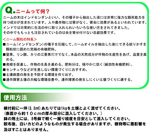 - 使用方法: 1坪(3.3平米)当たり1kgを土壌とよく混ぜて使用してください。地表から約10cmの深さの土に混ぜてください。