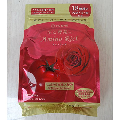- 肥料成分にアミノ酸や各種微量要素がスペシャルブレンドされたアミノリッチは、花付き・実付き・味を良くするアミノ酸効果が速く長く続くように植物性アミノ酸と動物性アミノ酸を配合。花・野菜の育成に最適な栄養バランスになるよう、効果の違う6種類の素材がブレンドされています。また、花色や葉色を良くし、欠乏症を予防する各種微量要素のCa・Mgなどが配合されています。肥料効果は約一か月です。