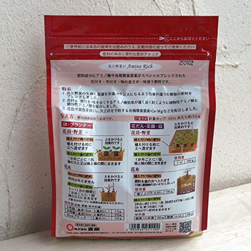 肥料成分にアミノ酸や各種微量要素がスペシャルブレンドされたアミノリッチは、花付き・実付き・味を良くするアミノ酸効果が速く長く続くように植物性アミノ酸と動物性アミノ酸を配合。花・野菜の育成に最適な栄養バランスになるよう、効果の違う6種類の素材がブレンドされています。また、花色や葉色を良くし、欠乏症を予防する各種微量要素のCa・Mgなどが配合されています。肥料効果は約一か月です。