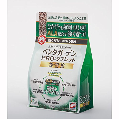 - ペンタガーデンは世界で初めてALA(5-アミノレブリン酸)を配合した家庭園肥料です。プロ向けの効果をご家庭で実現できます。このシリーズにはいくつかのタイプがありますが、ペンタガーデンPROタブレットはお庭や家庭菜園等で本格的なガーデニングを楽しみたい方向けの家庭園芸用固形肥料です。ALAによる光合成向上や肥料吸収促進の相乗効果により、日当たりの不足しがちな室内栽培にも最適な肥料です。 ALAは、葉緑素を増やし光合成能力を向上させるなど、植物の生長に役立つ天然アミノ酸です。根からの栄養吸収に関係する植物の体内酵素の働きを活性化させ、水や土中の肥料分の吸収を促進させたり、根の生育を促進するなど、さまざまな効果が得られます。ペンタガーデンPROタブレットは農業用化成肥料から生まれた、NPK成分に加えてALA(5-アミノレブリン酸)たっぷり配合のお得な固形肥料。条件によりますが30~60日間の効果が持続します。一部、有機成分が配合されています。