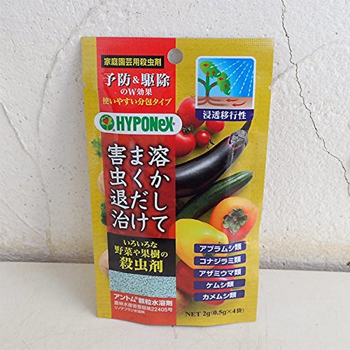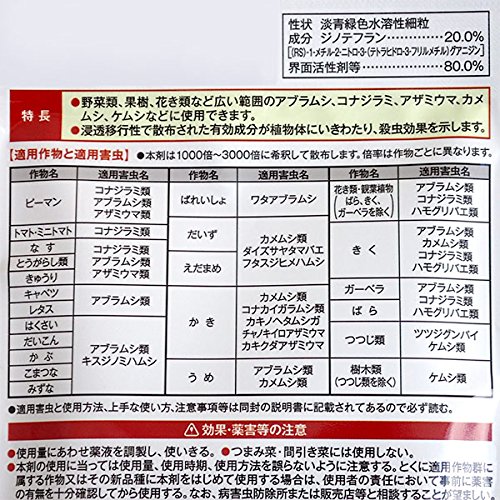 - ジノテフラン水溶剤:淡青緑色水溶性細粒内容量:0.5g×4袋ハイポネックス社製適用植物:ピーマン、トマト、ミニトマト、なす、とうがらし類、きゅうり、はくさい、キャベツ、レタス、だいこん、かぶ、こまつな、みずな、ばれいしょ、だいず、えだまめ、かき、うめ、花き類、観葉植物、きく、ガーベラ、ばら、つつじ類、樹木類など適用害虫:アブラムシ類、コナジラミ類、アザミウマ類、カメムシ類、ハモグリバエ類、ケムシ類など
