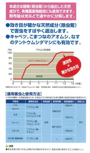 - 家庭菜園におすすめの殺虫剤です。効き目が確かな除虫菊エキスの天然成分で、分解が早く、有機農栽培にも使用が認められています。アブラムシ・ハダニ・アオムシ・テントウムシダマシなど広範囲の害虫を速やかに退治。野菜類についた害虫を見つけた時などに、応急用としても使用できます。
