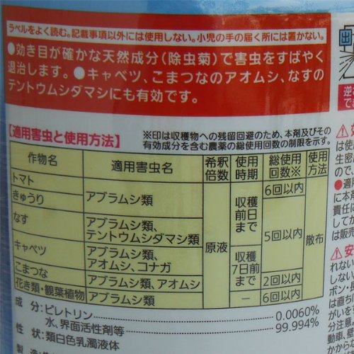 家庭菜園におすすめの殺虫剤です。効き目が確かな除虫菊エキスの天然成分で、分解が早く、有機農栽培にも使用が認められています。アブラムシ・ハダニ・アオムシ・テントウムシダマシなど広範囲の害虫を速やかに退治。野菜類についた害虫を見つけた時などに、応急用としても使用できます。