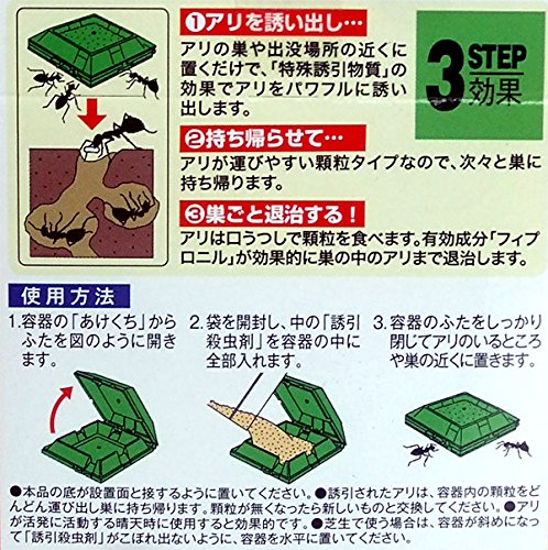 - 蟻の巣や出没場所の近くに本品を置くことにより、特殊誘引物質でアリを誘引し、餌と同じように巣に持ち帰ることによって巣ごと蟻を退治します。蟻は口うつしで餌を食べますので、有効成分フィプロニルが効果的に巣の中の蟻までを退治します。効果のある不快害虫:アカアリ、クロヤマアリ、アルゼンチンアリ等のタンパク質系を餌とする蟻ご使用場所として:ベランダ、縁側、庭成分:フィプロニル性状:淡黄色顆粒(誘引殺虫剤)容量:2個入(容器・誘引殺虫剤1袋2.5グラム各2個)住友化学園芸社製剤型・使用方法ハウスタイプ:通り道に設置(1)容器の「あけくち」からふたを開きます。(2)袋を開封し、中の「誘引殺虫剤」を容器の中に全部入れます。(3)容器のふたをしっかり閉じてアリのいるところや巣の近くに置きます。この薬剤の適用一覧及び使用法については住友化学園芸のホームページをご参照ください。