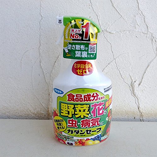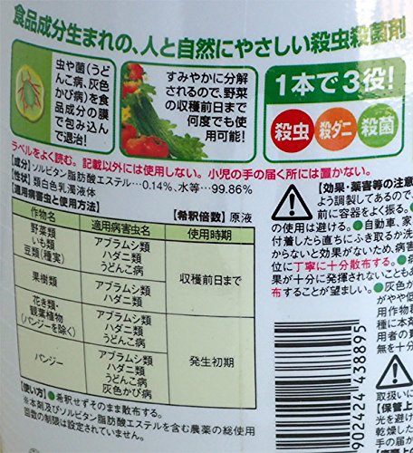 - 野菜や草花など色々な植物に使える、便利で安全な食品原料生まれの殺虫殺菌剤。食品成分である「ソルビタン脂肪酸エステル」が有効成分となり、すみやかに分解されて自然にかえります。天然成分100%ですので、野菜の収穫の前日まで使用でき、使用回数に制限はありません。害虫や菌を薄い膜に包み込むので、害虫は呼吸できずに窒息死し、病原菌は栄養を得られず死滅します。また、ノンガスタイプなのでいやなニオイもありません。逆さ噴射で葉裏にも散布できます。※「ソルビタン脂肪酸エステル」はでんぷんから得られた糖とヤシ油から作られた成分で、アイスクリームやケーキ等にも使われています。容量:1000ml(逆さ噴霧OK)有効成分:ソルビタン脂肪酸エステル対象となる虫と病気:アブラムシ・ハダニ・うどん粉病・灰色かび病フマキラー株式会社製