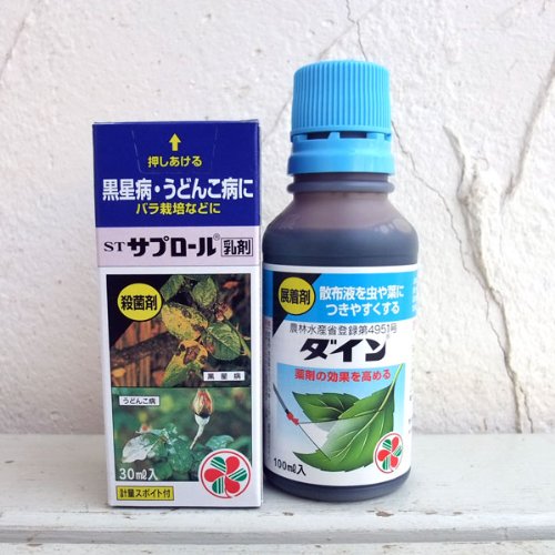 - 殺菌剤のサプロール乳剤30ミリリットル入りと薬の付きをよくする展着剤ダイン100ミリリットル入りのセットです。セット内容:・殺菌剤:サプロール乳剤30ミリリットル入りうどん粉病と黒星(黒点)病、さび病の専門薬です。特にバラの黒星病には優れた効果をがあります。散布後の葉の汚れも少なく、観賞価値を損ないません。葉の中に成分が浸透し、予防と治療の効果を発揮します。バラの栽培の必需品です。使用方法:800〜2000倍以上に希釈して散布してください。希釈液に少量の展着剤(ダインなど)を加えるとより効果的です。計量スポイトつき。30ミリリットル入り。主要成分:トリホリン・展着剤:ダイン100ミリリットル入り殺虫剤や殺菌剤などの散布液を虫や葉につきやすくする薬剤。薬剤を希釈する際、均一に混ざりやすくします。100ミリリットル入り。この薬剤の適用一覧及び使用法については住友化学園芸のホームページをご参照ください。