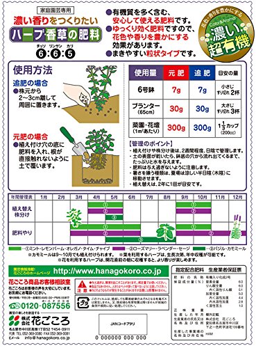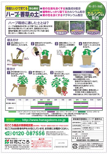 - 主原料:木質堆肥、軽石、ピートモス、バーミキュライト鉢底土の上にとハーブ・香草の土を2~3cm入れ、株を植え込んだらハーブ・香草の土を周りに隙間なく入れます。 鉢底の穴から流れ出るまでたっぷりと水を与え2週間程度日陰で管理します。 土の表面が乾いたらたっぷりと水を与えます。 <ハーブ・香草の肥料>リンサンやイオウを配合し、香りのよいハーブを育ててくれます。