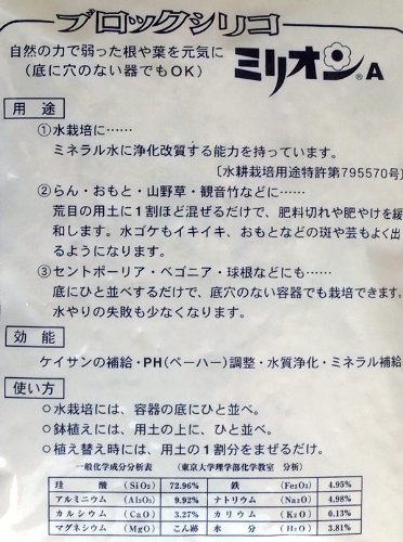 弱った植物をイキイキ健康に!土壌改良剤としてポピュラーなミリオンAです。 素材のケイ酸塩白土は秋田県に産出するモンモリロナイト粘土です。 この鉱物は「千の用途をもつ粘土」と呼ばれ、水や土に対して強力な浄化作用をもち、各方面で多目的に使用されています。 植物の栽培の際には、土に混ぜたり、水に溶かして使用します。