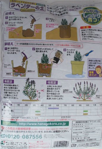 - 通常のハーブの土より蒸れにくく、成長力を引き出す配合のラベンダー専用培養土。ラベンダーの生育に適したアルカリ設計で、地力アップのabコンポを配合。ゆっくり長く初期肥料(IB肥料)入りです。主原料:木質堆肥、abコンポ、ココナッツファイバー、パーライトpH:7.0±0.5EC:0.6以下○使用方法庭植えの場合:水はけをよくするため、深穴を掘りラベンダーを入れ、高植えします。(できれば傾斜のある場所がよい。)鉢植えの場合:鉢底に鉢底石とラベンダーの土を入れ、苗をポットから外して植え替えます。大きな鉢は過湿になるので、苗の大きさにもより異なりますが、5~6号程度がおすすめです。1袋5リットル入り、2袋セットです。
