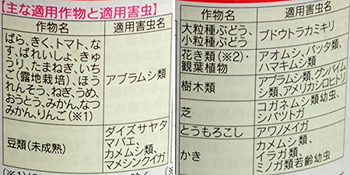 - 、チャドクガ、ネキリムシ(タマナヤガ)、シバツトガ、ハマキムシ(ハマキムシ類、コカクモンハマキ)、アカフツヅリガ、メイガ(ハイマダラメイガ、アワノメイガ、ダイコンシンクイムシ)、ヨトウムシ(スジキリヨトウ、ハスモンヨトウ、ヨトウムシ)、カキノヒメヨコバイ、ケラ、フタテンヒメヨコバイ、ゴボウノミドリヒメヨコバイ対象作物[花き・観葉]花き類・観葉植物、ばら、きく、カーネーション、宿根かすみそう、アスター、ソリダコ、スターチス、シネラリア、斑入りアマドコロ、ききょう、芝[野菜]トマト、なす、きゅうり、かぼちゃ、しろうり、すいか、メロン、いちご、ほうれんそう、とうもろこし、豆類(種実、ただし、あずき、えんどうまめ、そらまめを除く)、あずき、えんどうまめ、そらまめ、未成熟そらまめ、豆類(未成熟、ただし未成熟そらまめを除く)、たまねぎ、ねぎ、ばれいしょ、かんしょ、モロヘイヤ[庭木]つつじ、一般樹木、樹木類(木本植物)、せんりょう、こでまり、しきみ、にしきぎ、しゃりんばい、だいおうしょう、さかき、さつき、さんごじゅ[果樹]みかん、なつみかん、ぶどう、うめ、もも、おうとう、かき、りんご、オリーブ、たら