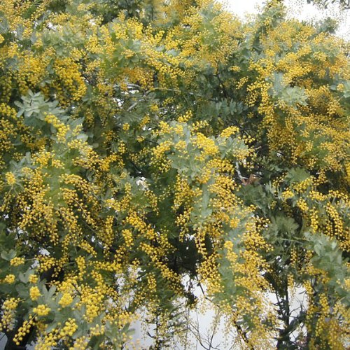 - 黄色の小さな花が集まった花房を枝いっぱいに咲かせ、輝くような明るさ。切花としても美しく、楽しめる品種です。また、常緑で銀白色の羽毛のような葉が美しく、お庭のシンボルツリーにも最適です。繊細なイメージですが生育力は旺盛です。庭植えでは樹高3~10mにも育ちますが、コンテナでコンパクトに育てることもできます。寒さには多少弱いので、寒地では鉢栽培にして冬は軒下にとりこんでください。