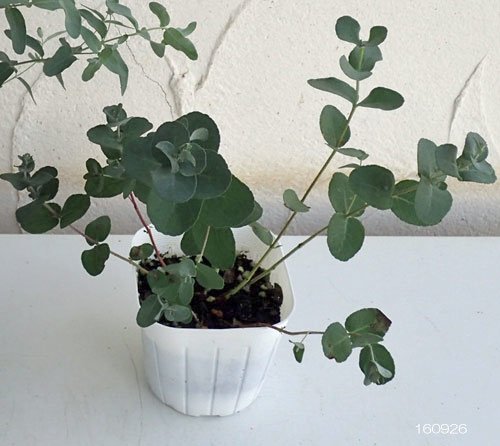 - ユーカリはフトモモ科の常緑性高木。 幼葉が楕円形で、銀葉品種。 普通のユーカリよりも小さな葉が密につく品種です。 秋に白色の花を咲かせます。 鉢植え、切花やドライフラワーに利用されます。 原産地のオーストラリア地方では、20mにも達するようになりますが、日本で鉢植えする場合2~3mに位にとどめます。