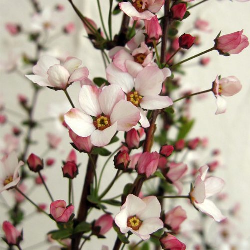- 白いユキヤナギのイメージを一新する、蕾がピンクで開花すると淡いピンクから白になる品種です。優しく春らしい風情で人気をです。秋の紅葉も楽しめます。