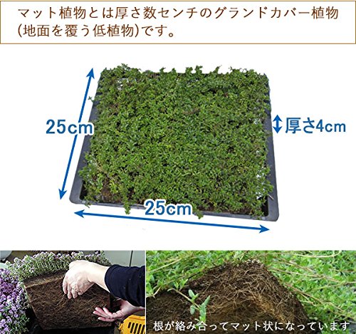 - マット植物とは、深さ数cmの薄層基盤で成育させたグランドカバー用植物です。 植物の根が互いにからみあい、1枚のマットのように取り扱うことができます。 軽量で土量が少なく、施工が楽なため、屋上やベランダの緑化に便利です。 (屋上やベランダなど、建物に敷設する場合は、必ず防根シートを敷いた上にウレタンフォームや屋上用の軽量土壌を敷き、その上にマット植物を並べてください)また、お庭の土の上に敷きこめばすぐにきれいなグランドカバーが完成し、ガーデニングにもおすすめです。