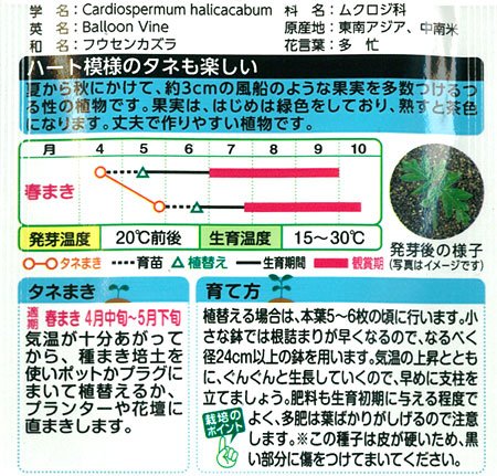 - 学名:Cardiospermum halicacabum まき時:4月中旬~5月下旬(発芽適温:15℃~26℃) 観賞:7月~10月 内容量:2.5ml(15粒前後)