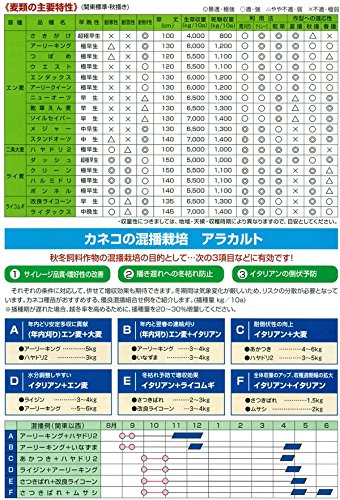- ○果樹園草生栽培、野菜の連作障害回避、冬~春期の風塵防止対策に有効です。 <ハルミドリの効果> ・冬~春期は緑のじゅうたんで雑草を抑制、地域の景観形成が良好 ・稲ワラ代用で、自園自給で多量の乾物有機質を確保 ・長グツ、脚立に泥が付かず冬期剪定作業が能率化 ・早春の季節風による飛砂を防止、園地を環境保全。 ・他感作用でモンパ病、疫病などの病害を抑制。