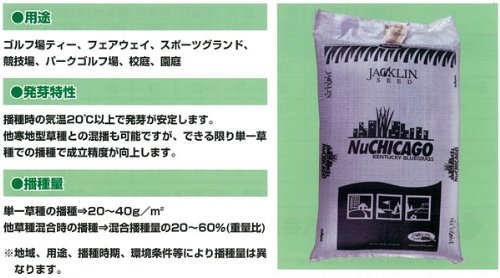 - 品種名:NuCHICAGO Kentucky Bluegrass 内容量:1kg 草丈(平坦地参考):20~30cm 純度:85% 発芽率:75% 粒数:3000粒/g 成育型:そう生型・地下茎 播種適期:3月~6月・8月~11月 用途:ゴルフ場ティー、フェアウェイ、スポーツグランド、競技場、パークゴルフ場、校庭、園庭 播種量:(地域、用途、播種時期、環境条件などにより異なります) ○単播…20~40g/平方メートル ○混播…混合播種量の20~60%(標準比) 利用目的や環境条件に適合する混合草種により、その配合比は異なります。 ※オーバーシード…20~40g/平方メートル ※運動場…20~30g/平方メートル ※ゴルフ場ティーグラウンド…30~40g/平方メートル ※ゴルフ場フェアウェイ…20~30g/平方メートル