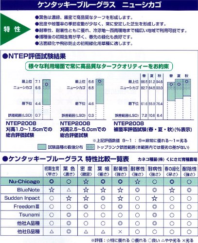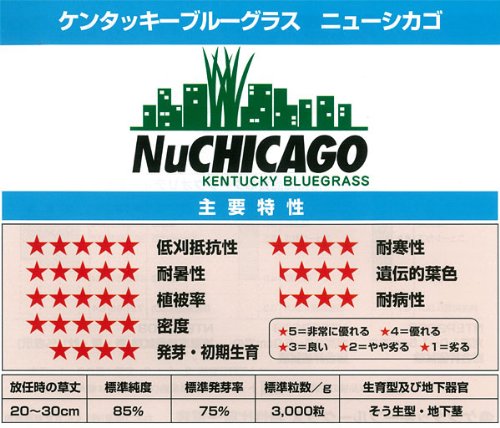 - ゴルフ場のティーグラウンド、フェアウエイ、スポーツグラウンド、校庭などに利用される、スポーツターフ用(業務用)の西洋芝の種です。ケンタッキーブルーグラス ニューシカゴは、葉幅が細く、葉色は濃緑色で、密度の高い芝生(ターフ)を形成します。耐寒性に優れ、耐暑性も強く、広い地域に適応できます。初期生育がよく、ターフ形成が早いです。幅広い刈り高(10mm~75mm)に対応でき、一年を通してターフクオリティーは優秀です。耐病性に優れ、特にリーフスポット病、ネクロティックリングスポット病に強いです。また、うどんこ病、さび病、ブラウンパッチ病、ダラースポット病などにも強い抵抗性を持っています。競技場、パークゴルフ場、園庭などにも利用されています。
