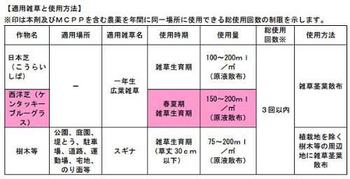 - 日本芝(こうらいしば)、樹木等(公園、庭園、堤とう、駐車場、道路、運動場、宅地、のり面等) ※ケンタッキーブルーグラスに使用する場合、発芽直後やターフ形成の不十分な状態では使用しないでく ださい。 [使用時期][1平米当たり使用量][総使用回数] 日本芝:雑草育期:100~200ミリリットル:3回 効果・薬害等の注意点: