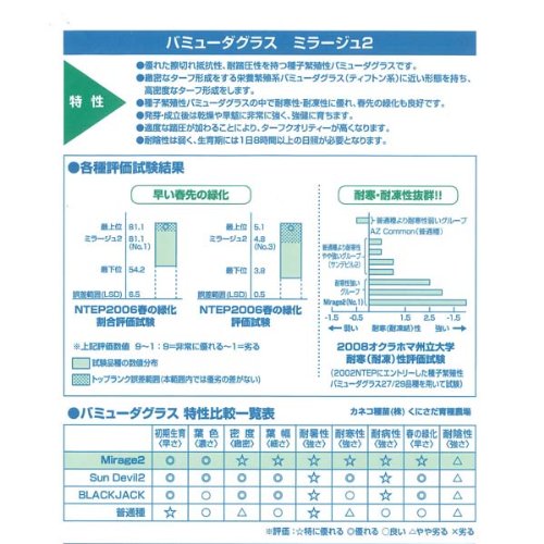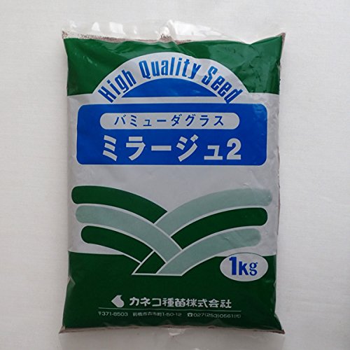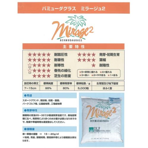 - ゴルフ場や競技場などのスポーツターフ用(業務用)の西洋芝の種、バミューダグラス ミラージュ2(ツー)です。ミラージュ2は暖地型の多年性芝生の種で、ティフトンに最も近いといわれる画期的なバミューダグラス。緻密なターフを形成する栄養繁殖系バミューダグラス(ティフトン)に近い形態を持ち、高密度なターフを形成します。優れた擦切れ抵抗性、耐踏圧性を持つ種子繁殖性品種です。耐寒性、耐凍性に優れ、春先の緑化も良好。発芽、生育後は乾燥に非常に強く、強健に育ちます。茎が横に伸び広がるタイプです。適度な踏圧が加わる事により、ターフクオリティが高くなります。耐陰性は弱く、生育期は1日8時間以上の日照が必要となります。まき時は関東標準で6~8月上旬がベストですが、暑い季節は水切れしやすいため、種まき後十分に発芽するまで絶対に水を切らさないようご注意ください。発芽後1か月ほど経過し、指を差して第一関節の深さまで葉が茂ってきたら刈り込みを開始してください。